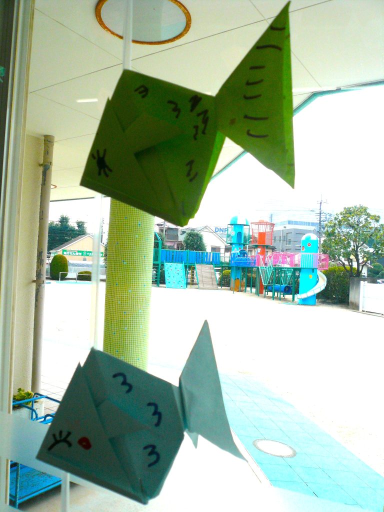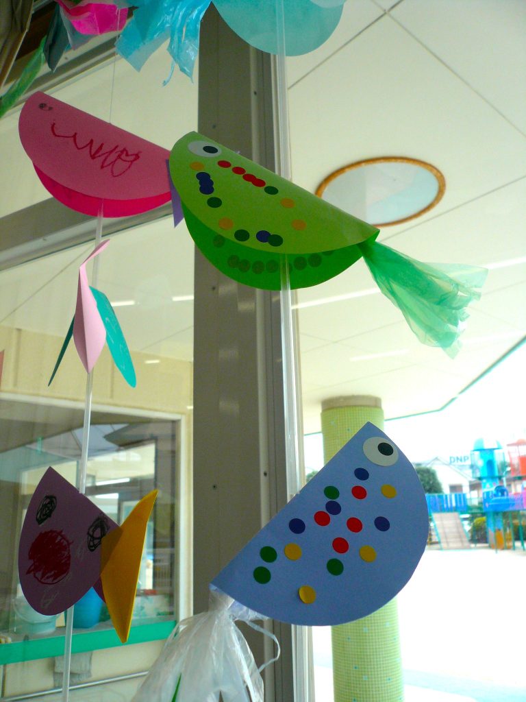 写真は、全園児共同制作の窓飾りです。今夏は少しでも涼しく過ごせるように、様々な色や形の魚を作りました!
