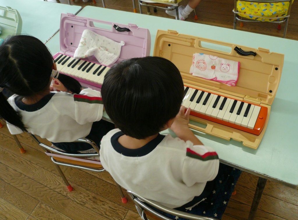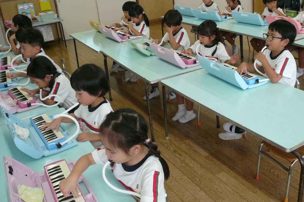 香取第二幼稚園では年中組より、鍵盤ハーモニカに親しむ時間を取り入れています。夏休み明け、めきめき上達してきた頑張り屋さんたちの練習風景をお見せします。