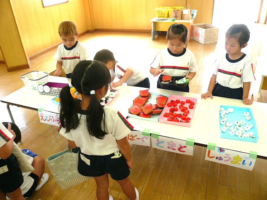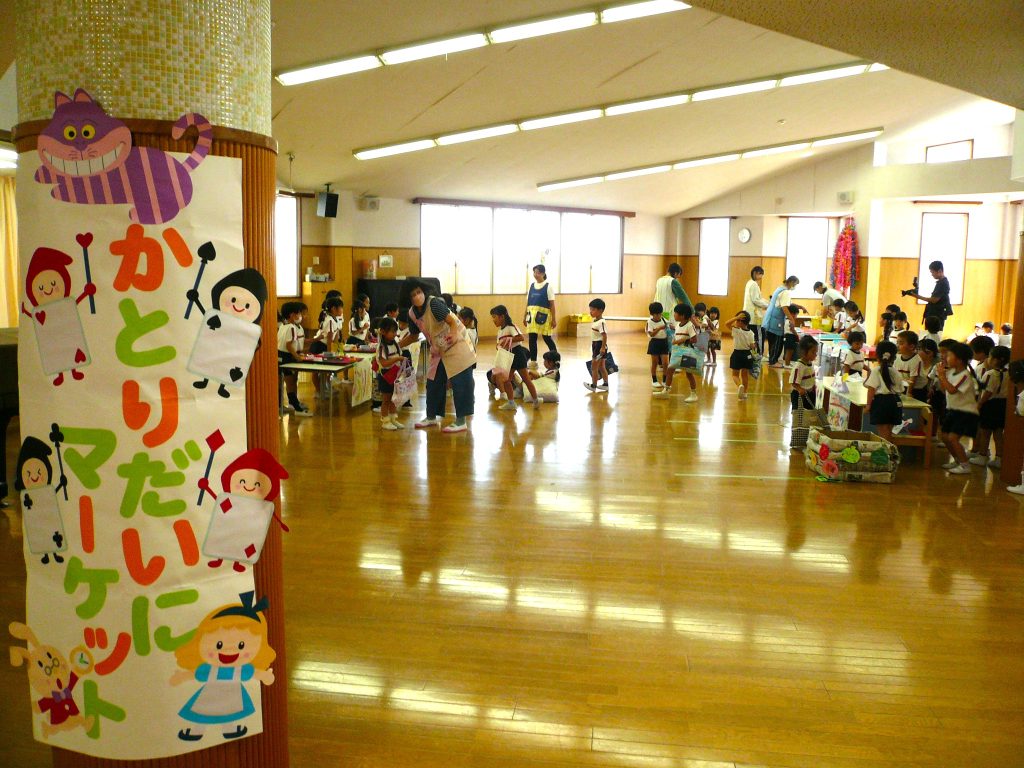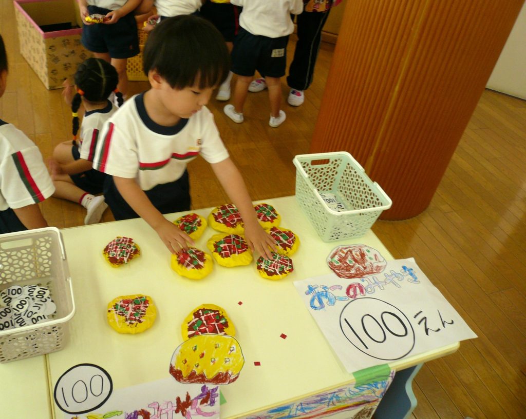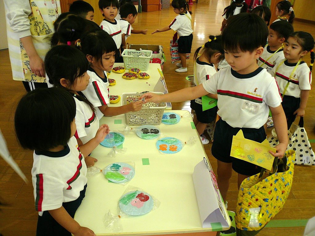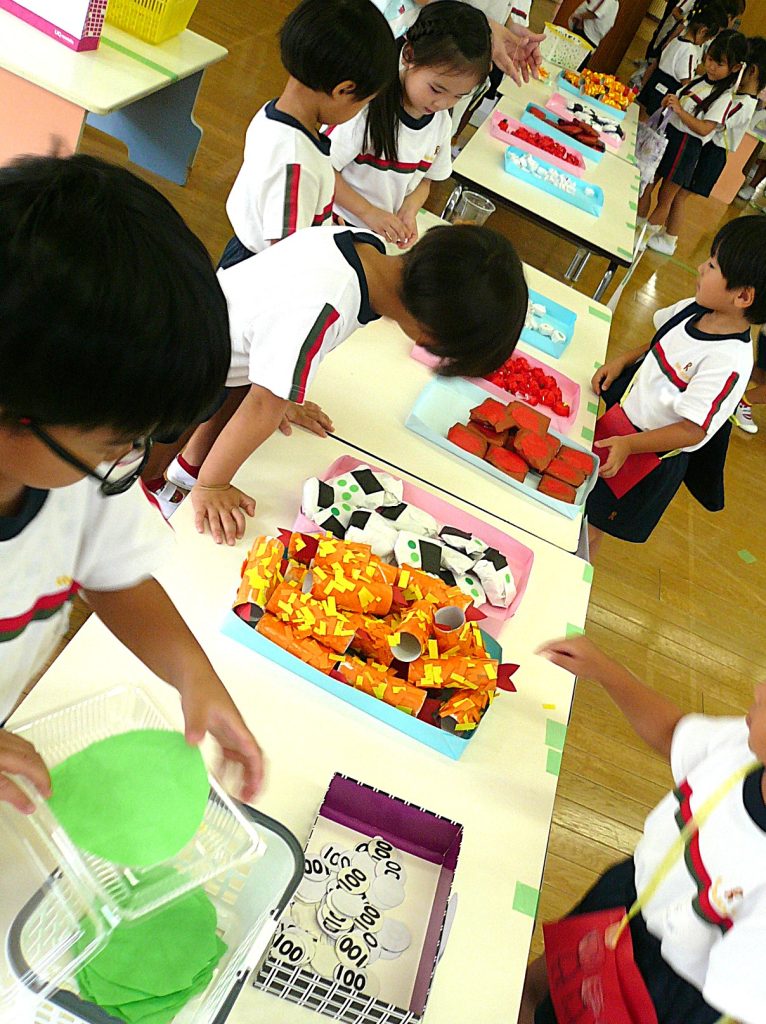 何を買おうか迷いながら、列に並んで手提げ袋にたくさん品物を入れていく年長組さん、先生と一緒にひとつずつお買い物をしていく満3歳児クラスのお友だち、どの子もみんな楽しそうでした!