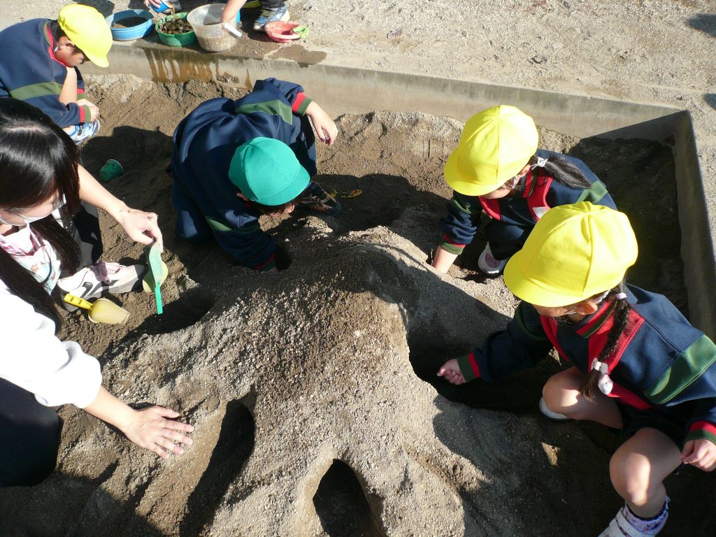 枯葉が冬の訪れを感じさせる今日この頃、晴天の日がつづき、砂場での遊びもダイナミックになってきました。