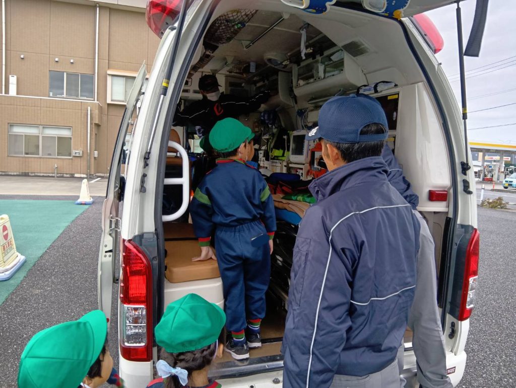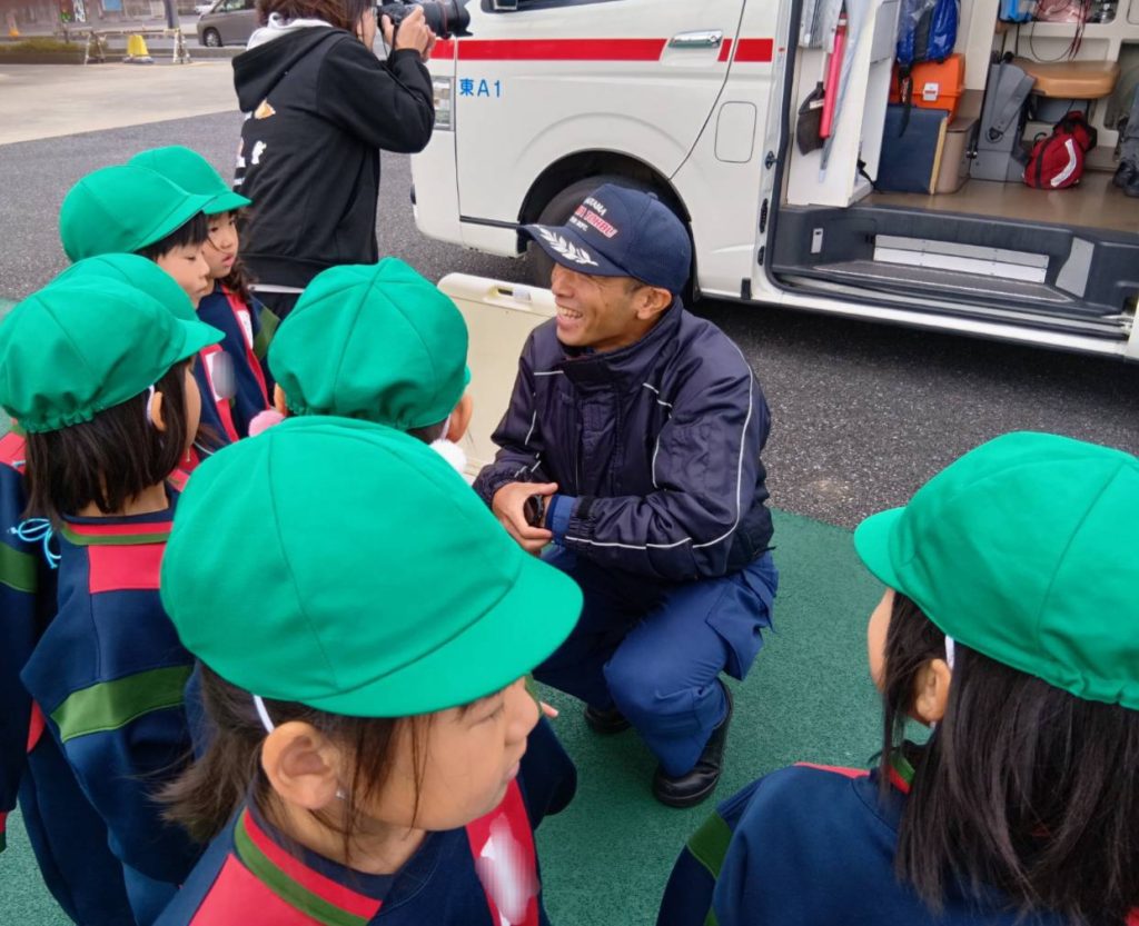 救急車の中に入って内部の様子を見学したり、消防車にはいくつも種類があることを教えていただいたりしました。